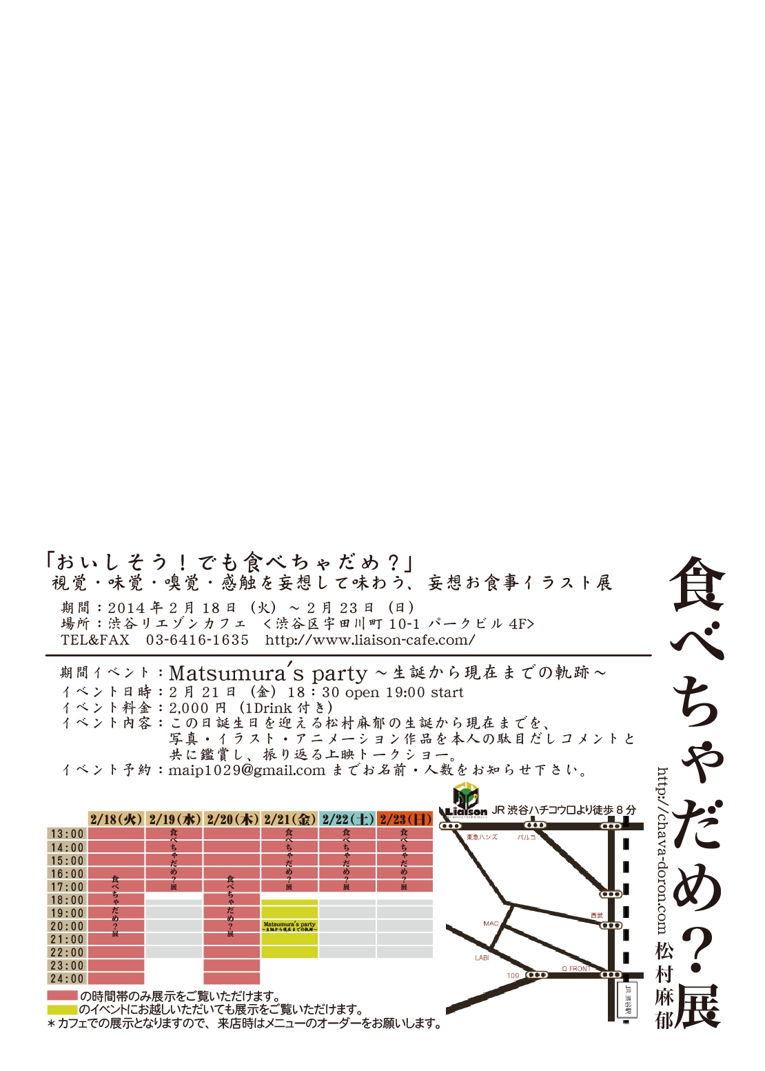 イベント内容:この日誕生日を迎える松村麻郁の生誕から現在までを、写真・イラスト・アニメーション作品を本人の駄目だしコメントと共に鑑賞し、振り返る。